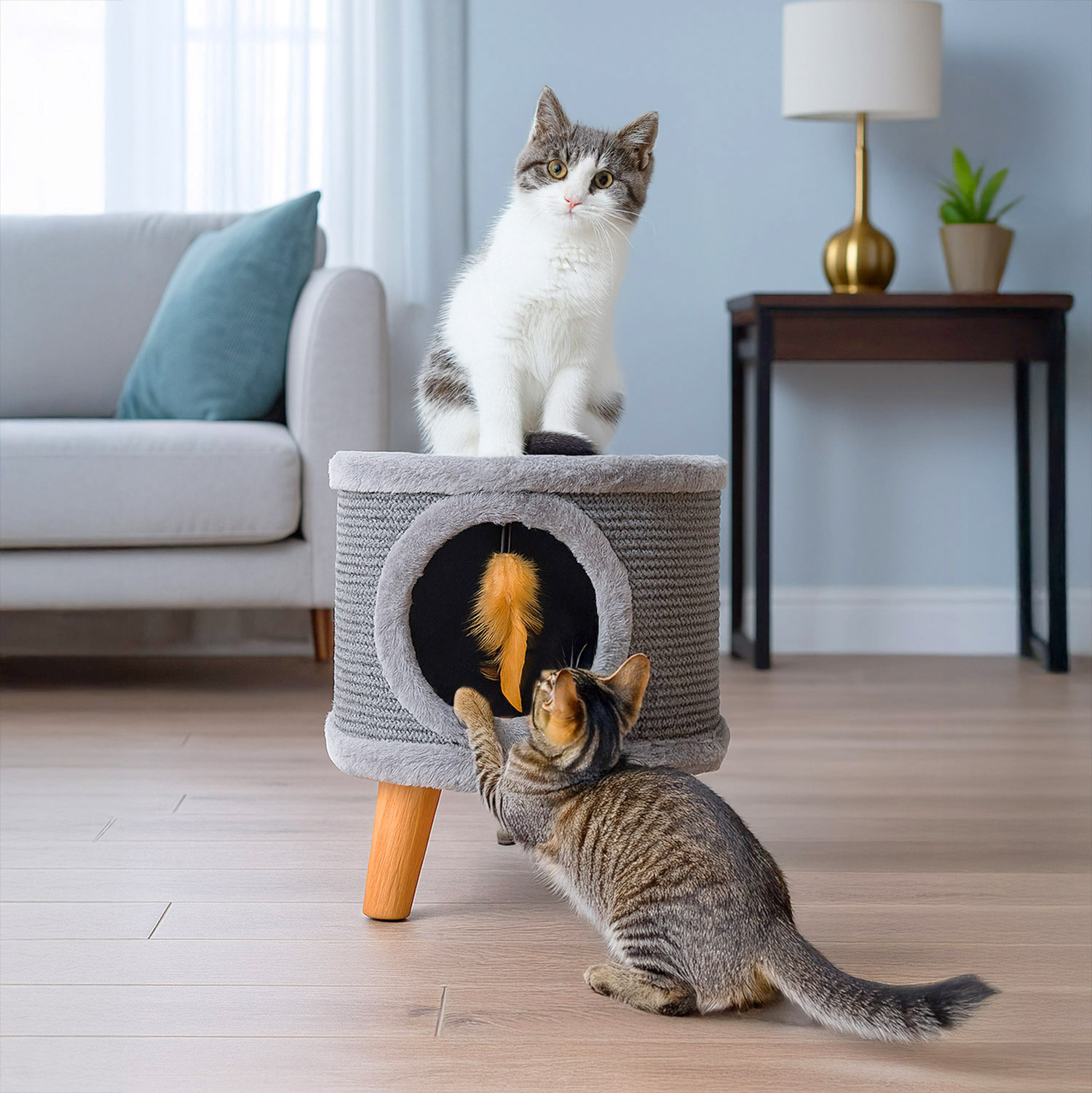 Solidny drapak dla kota, mały 38cm, szary z piórkiem i legowiskiem Cabin II