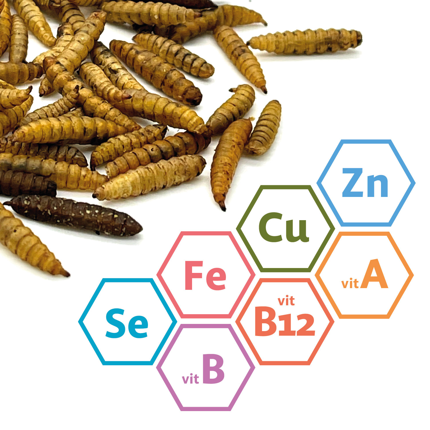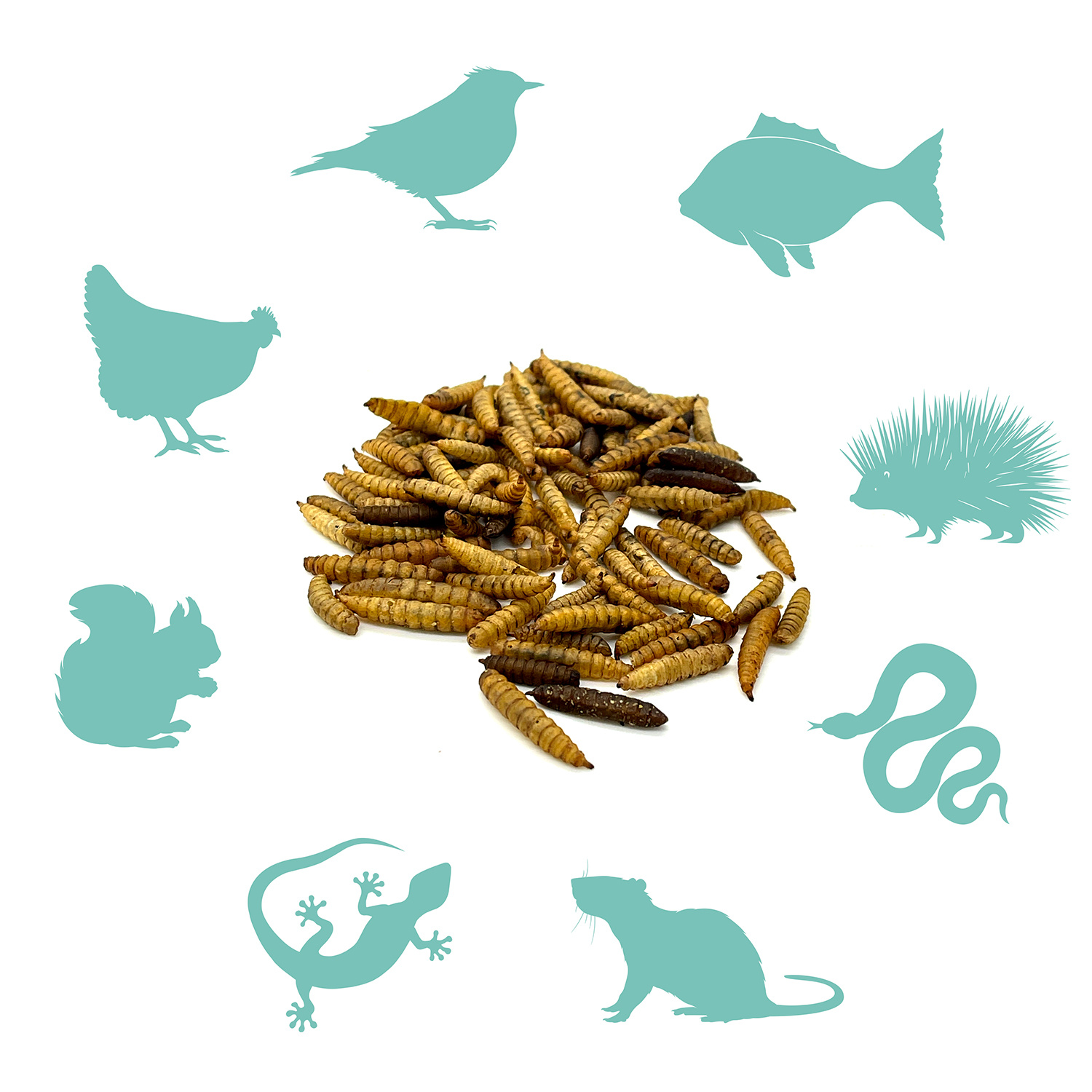 - W 100% naturalne: suszone larwy muszki czarnej żołnierskiej, bez konserwantów, barwników i sztucznych dodatków.